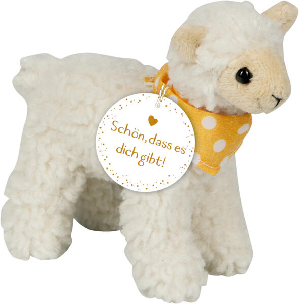 Dieses kleine Plüschlamm mit gelbem Halstuch schenkt Wärme, Nähe und Geborgenheit. Ob zur Geburt, Taufe oder als kleine Aufmerksamkeit zwischendurch: Das süße Schäfchen aus Plüsch lässt Kinder- und Erwachsenenherzen höher schlagen. Dank des Hangtags für persönliche Widmungen wird es zu einem unvergesslichen Geschenk.