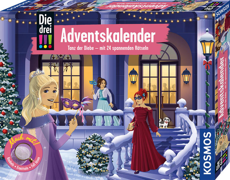 Wer versteckt sich hinter der Maske? Auf einem glamourösen Maskenball in der Oper wird ein wertvolles, juwelenbesetztes Halsband gestohlen und mit ihm das Schoßhündchen eines berühmten Modedesigners. Die drei ! ! ! starten sofort mit ihren Ermittlungen. 24 Tage lang die spannende Detektivgeschichte lesen und dabei jeden Tag ein kniffliges Rätsel lösen, das zum nächsten Türchen führt. Nach und nach füllt sich die Ermittlungs-Wand und man kommt dem Dieb einen Schritt näher. Ein Adventskalender voller Spannung, Rätselspaß und 24 Detektiv-Überraschungen für Kinder ab 8 Jahren!