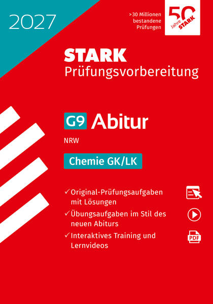 Chemie GK/LK - Abitur 2027 NRW - PrüfungsvorbereitungUnverzichtbar für's G9-Abi! Dieser Band ermöglicht eine optimale Vorbereitung auf das Chemie-Abitur (Grundkurs und Leistungskurs) am Gymnasium und an der Gesamtschule in Nordrhein-Westfalen. Zum selbstständigen Üben zu Hause und für den Einsatz im Unterricht. Im gedruckten Band finden Sie:Übungsaufgaben für den GK und den LK im Stil der neuen Prüfung, passend zum neuen Kernlehrplan damit Sie genau wissen, worauf es in der Abiturprüfung ankommt. die Original-Abituraufgaben des Leistungskurses 2022 bis 2025 zur realistischen Prüfungssimulation. ausführliche, gut nachvollziehbare Musterlösungen zu allen Aufgaben und hilfreiche Tipps zur Lösungsstrategie perfekt zur Selbstkontrolle. Hinweise zu Ablauf und Anforderungen des Chemieabiturs so kann Sie nichts mehr überraschen. Über unsere Plattform MySTARK haben Sie Zugriff auf:die Original-Prüfungsaufgaben 2026 (GK und LK) mit vollständigen Lösungsvorschlägen ideal als letzter Test für den Ernstfall . die Abituraufgaben und Lösungen des Grundkurs-Abiturs 2022 bis 2025 zum Downloadanschauliche Lernvideos für ein noch tieferes Verständnis zentraler Themen des Kernlehrplans. interaktive Übungsaufgaben zum Training des chemischen Fachwissens am PC oder Tabletgezielte Wiederholung von relevanten Themenbereichen der Oberstufe Chemiesofortige Ergebnisauswertung mit individuellem Feedback und MusterlösungWissenslücken und die Stoffbereiche zum Nachholen ganz leicht erkennen Hinweis: Alle Inhalte auf der Plattform MySTARK stehen bis 31. 12. 2027 zur Verfügung. Starten Sie jetzt mit der Vorbereitung auf das Chemie-Abi und gehen Sie mit Selbstvertrauen in die Prüfung!