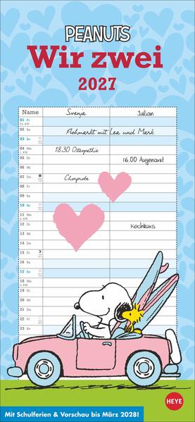 - Gemeinsam planen - gemeinsam schmunzeln: Mit dem neuen Peanuts-Wandkalender 2027 für zwei- Zwölfmal Best-of für unseren jährlichen Kalender: Cartoons vom unschlagbaren Duo Snoopy und Woodstock- Für alle, die richtig was vorhaben: Partnerkalender mit zwei breiten Spalten und praktischen Extras wie Schulferienübersicht und 3-Monats-Vorschau auf das Jahr 2027- Passt sogar in die Hundehütte: Wandplaner im Hochformat 16 x 34, 7 cm- Begeistert Fans von Charlie Brown und Co. in jedem Alter: Ein Kalender-Klassiker aus dem Hause Heye im Athesia Kalenderverlag- Mit Schulferien und Vorschau bis März 2028
