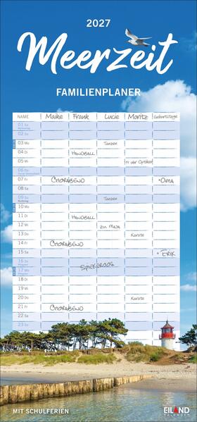 - Die ganze Schönheit der deutschen Küste entdecken: der große Familienkalender 2027 mit atemberaubenden Meeres-Motiven- Immer alles im Blick mit unserem alltagstauglichen Familienplaner: 5 Spalten Platz für alle wichtigen Termine von A wie Arztbesuch bis Z wie Zirkusvorstellung- Monat für Monat Wattenmeer, verträumte Küstenorte und faszinierende Naturfotografie: mit 12 hochwertigen Bildern in brillanten Farben- Bringt "Meer" Flair in jede Küche: Der praktische Kalender für Familien im 21 x 45 cm Hochformat, mit Schulferienübersicht- Besser planen für Küstenromantiker: die Wandkalender von Eiland im Athesia Kalenderverlag