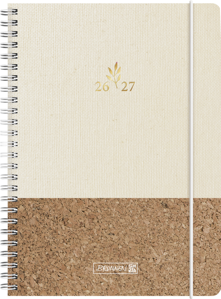 Blattgröße: 148×210 mm; 208 Seiten, Druckfarbe Kalendarium: beige; Wire-O-Bindung; Textil-Einband, Hardcover, mit Kork-Applikationen, abgerundete Ecken, Farbe: creme, braun, partielle Folienveredelung, Gummizugverschluss; Eckperforation; Monatsplan April 2026 bis Dezember 2027, Ferientermine Deutschland, Österreich, Schweiz, Frankreich, Belgien, Luxemburg, Niederlande und Südtirol, 9 Seiten Notizen, 2 Seiten Stundenpläne und 2 Seiten Notenübe. . .